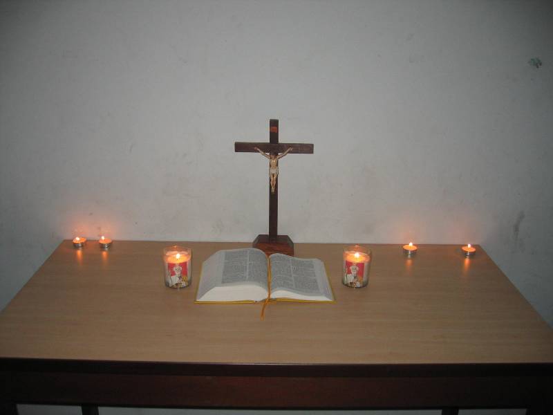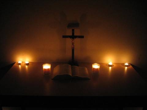 up with candles, Uncle V brought down the Crucifix, 2 big candles and the Bible